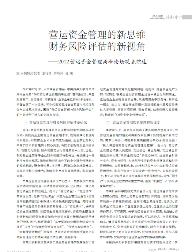《财务与会计》杂志2013年第1期:“营运资金管理的新思维财务风险评估的新视角— 2012营运资金管理高峰论坛观点综述”