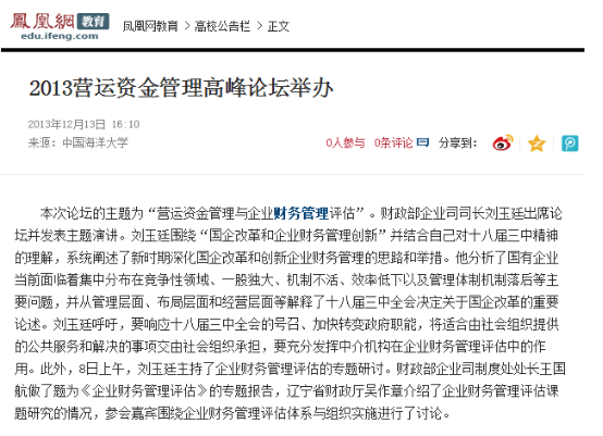 《凤凰网》2013年12月13日凤凰教育专栏报道:“2013营运资金高峰论坛举办”