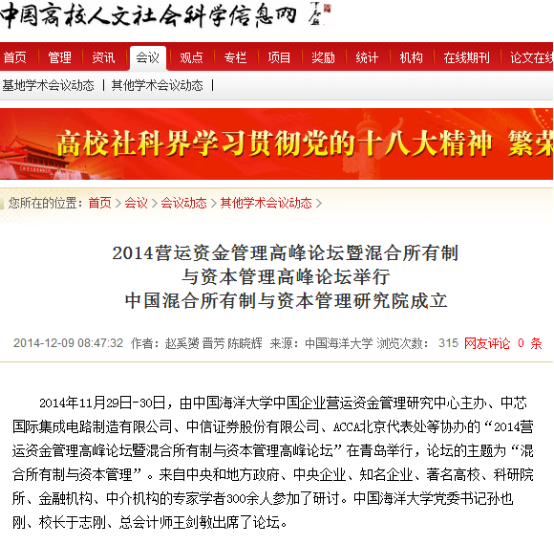 《中国高校人文社会科学信息网》2014年12月09日报道:2014营运资金管理高峰论坛暨混合所有制与资本管理高峰论坛举行 中国混合所有制与资本管理研究院成立