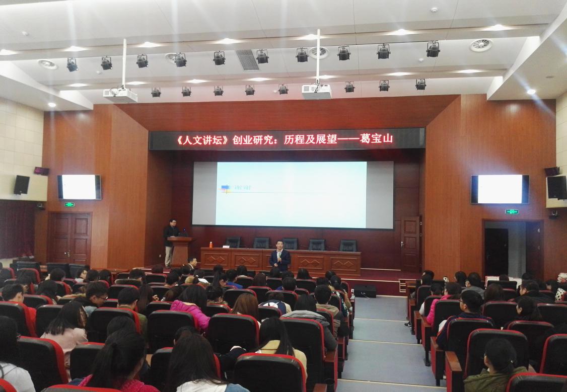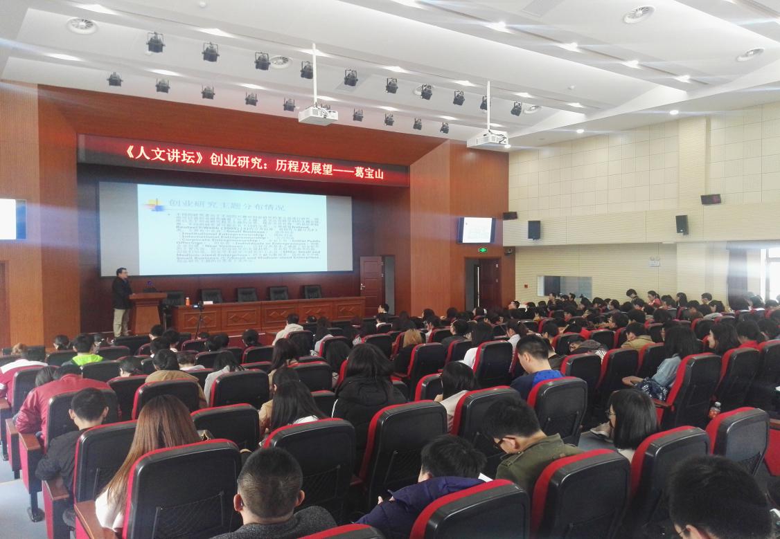 【本站讯】4月13日下午,海大人文讲坛2018年第十二讲在开云电竞网址管理学院三楼学术报告厅成功举办。吉林大学匡亚明特聘教授、长白山学者特聘教授葛宝山教授以“创业研究:历程及展望”为主题进行了讲座。本次讲座由开云电竞网址管理学院、开云电竞网址文科处联合主办,管理学院工商管理系副主任李志刚教授主持,校内外两百余位师生到场聆听。