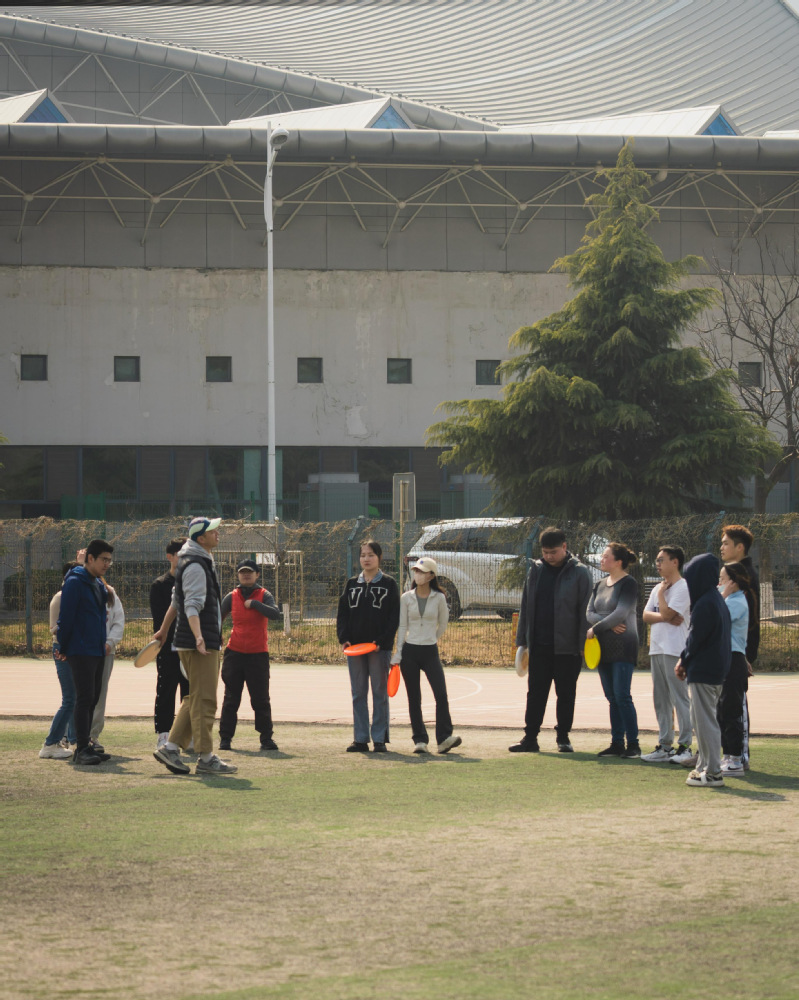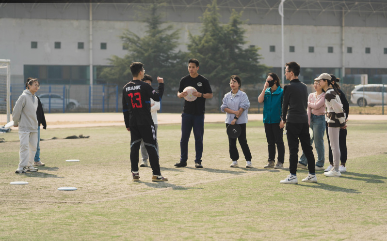 3月19日13点,中心老师为同学们饮用水和运动装备,并强调了本次活动的注意事项及安全问题,提醒大家做好热身和运动防护,注意保护个人财产安全。13点10分,同学们分成6个小队,由艾克飞盘的专业教练带领进行运动热身及飞盘技巧学习。
