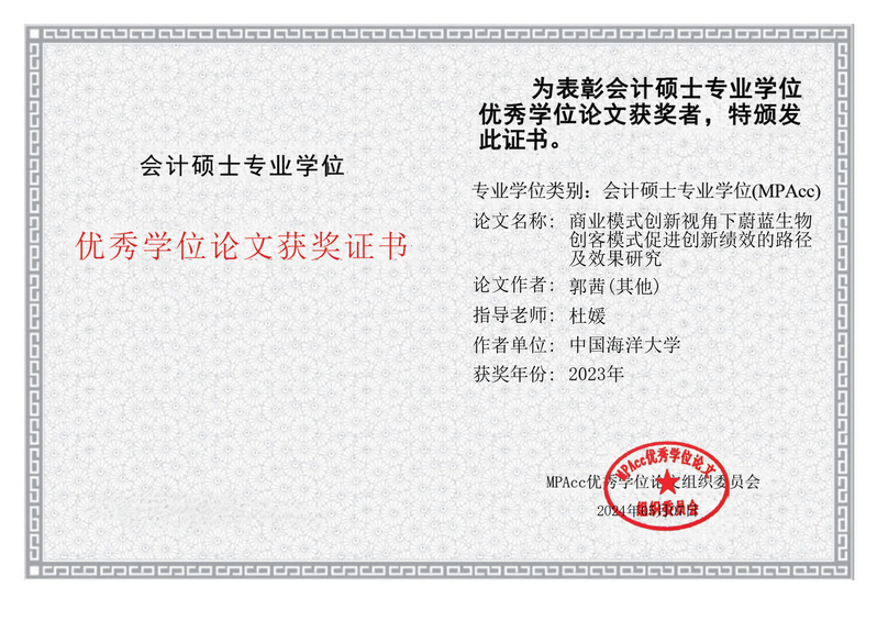 2024年5月8日,全国会计专业研究生教育指导委员会正式公布“2023年会计硕士专业学位优秀学位论文评选结果”和“2023年MPAcc优秀教学案例入库名单”。我校2023届会计硕士毕业生郭茜撰写的学位论文《商业模式创新视角下蔚蓝生物创客模式促进创新绩效的路径及效果研究》(指导教师:杜媛)获评“2023年MPAcc优秀学位论文”;教学案例《五大轨道显神通:A地铁数字化转型赋能管理会计创新之路》(开发人:孙莹、李树青、武钰、董金琳)入库。