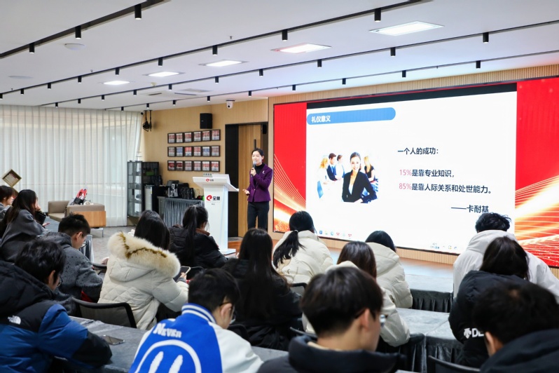 在青岛人才赋能中心工作展厅,师生参观并现场聆听了青岛市人才环境与人才政策介绍,并邀请闫云霏老师向同学们讲授职场礼仪培训课程,多方面赋能职场竞争力。