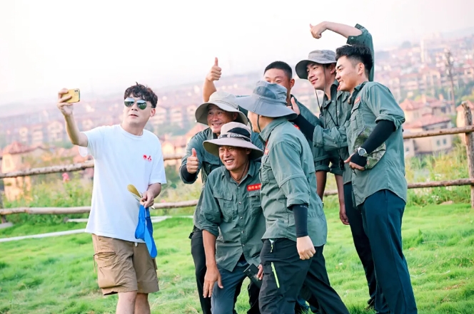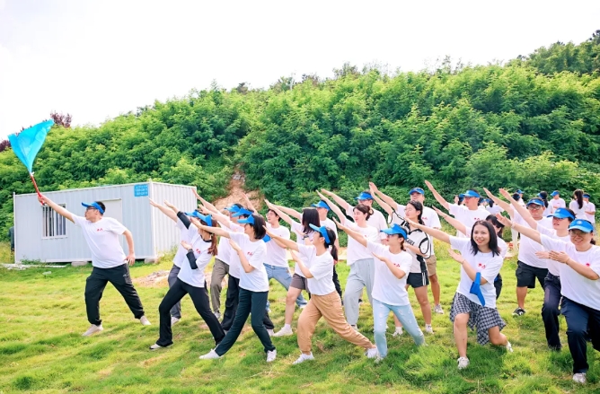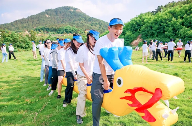 大家汇聚在草坪上进行了破冰分组,后分头进行了考验团结协作的旱地龙舟、团队战鼓,验证心沉手稳的重走长征路、动力圈等活动。