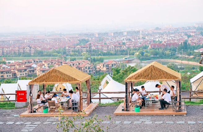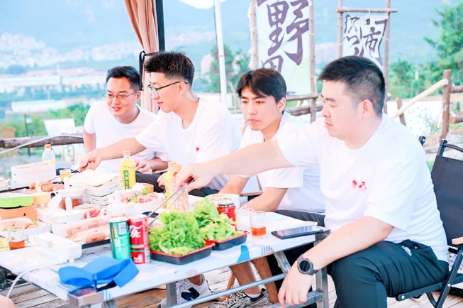 拓展训练后,同学们分组聚集在一起,在夕阳中体验了露营烧烤的乐趣。