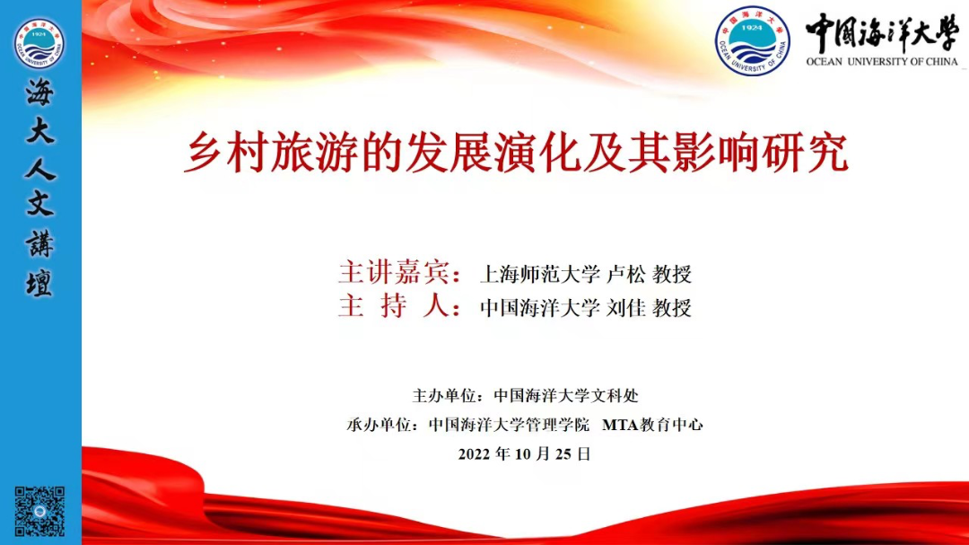 为丰富旅游管理专业师生的科研生活,更好地把握新形势下旅游学术研究的理论前沿与时事热点,2022年10月25日(周二)19:00-21:00,由开云电竞网址文科处主办,开云电竞网址管理学院和MTA教育中心联合承办的海大人文讲坛系列专家讲座《乡村旅游的发展演化及其影响研究》如期举行。