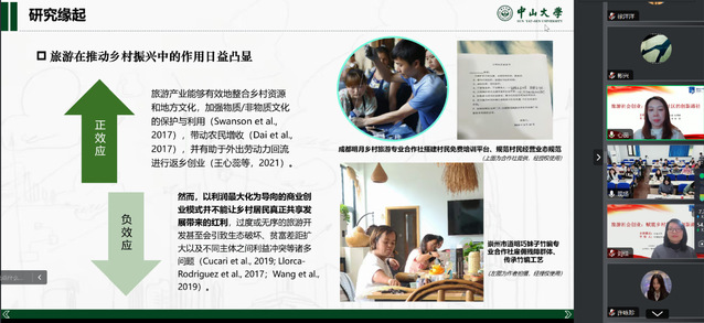 随后,王心蕊老师围绕讲座主题展开了深入而全面的阐述。她强调,乡村旅游的发展不仅要重视经济收益,还应促进社会价值,以实现短期增长和长期可持续性之间的平衡。有效的旅游社会创业能够缓解欠发达地区贫困、解决环境问题并提升社区参与能力。王心蕊老师在讲座中结合研究成果,通过四川明月村和竹艺村作为研究案例地、三篇系列研究成果系统呈现了旅游社会创业促进乡村旅游地共同富裕的理论机制和实践探索。她表示,旅游社会创业为乡村振兴提供了新的发展路径。