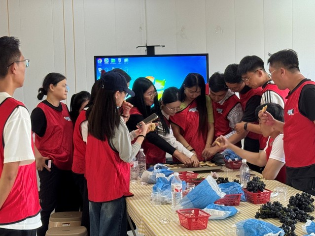 随后开展的农场葡萄大作战环节将课堂延伸至田间地头。学员们深入农业种植基地,在专业人员的指导下学习葡萄栽培等知识,亲手体验果实采摘的乐趣。通过分工配合,各队不仅高效完成了采摘任务,更在劳动中体会到农业与旅游产业的深度融合价值。