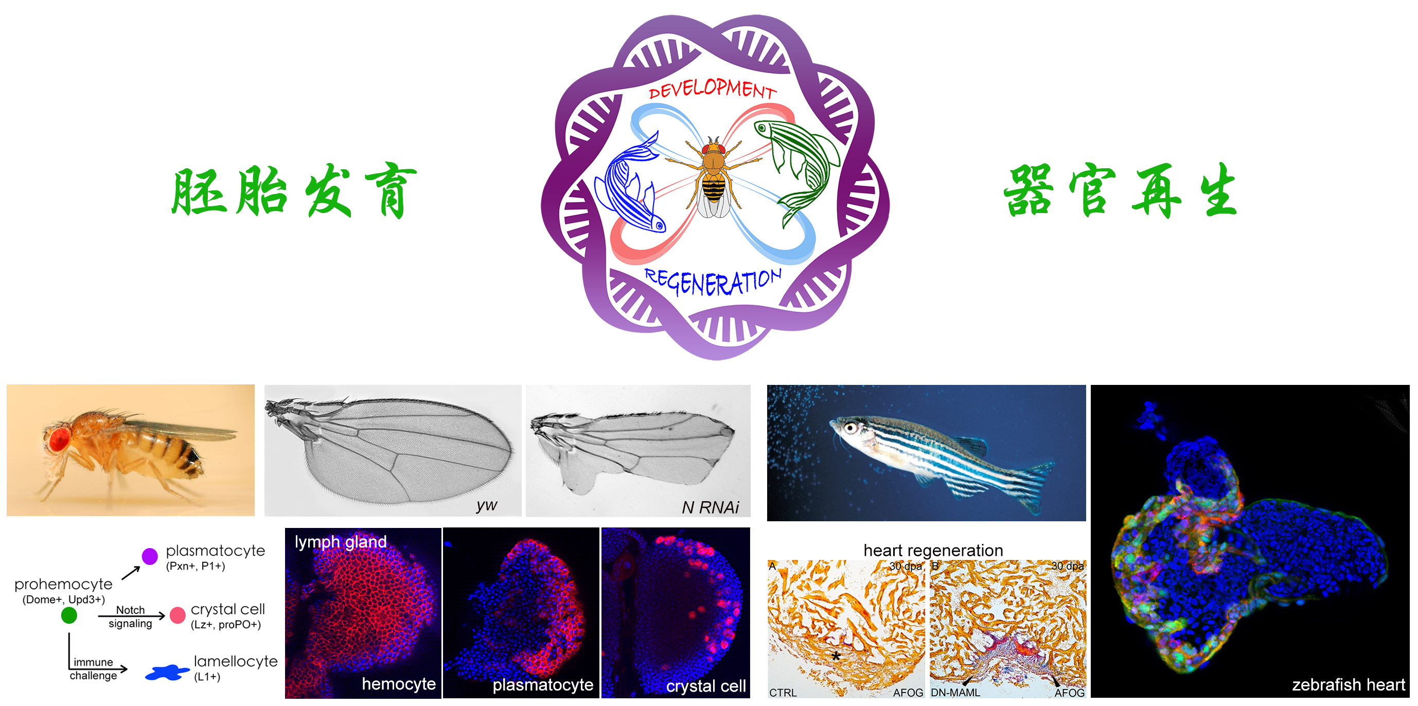 本实验室以果蝇和斑马鱼为主要模式生物,结合遗传学、组学、分子生物学、显微成像与定量分析等现代技术,系统研究Hedgehog、Notch、JNK等多种重要发育信号的相互交织决定细胞命运的分子机理,以及细胞命运决定之后的细胞行为驱动胚胎发育以及器官(心脏)再生的作用机理。
