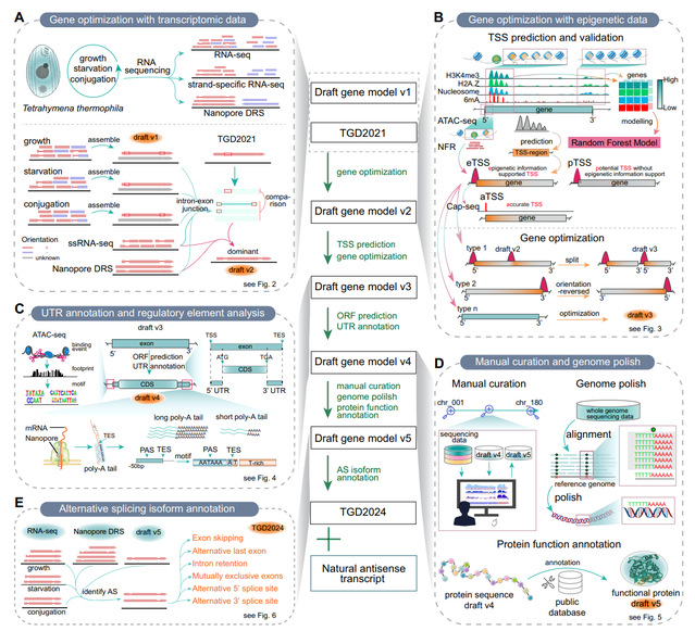 嗜热四膜虫(Tetrahymena thermophila)是一种广泛应用于基础生物学研究的单细胞模式真核生物,曾因核酶和端粒酶的研究分别斩获1989年诺贝尔化学奖和2009年诺贝尔生理或医学奖。四膜虫大核基因组已历经多次组装和注释,其中包括2020年由海洋生物多样性与进化研究所原生动物学团队高珊教授课题组率先完成的端粒到端粒的完整基因组组装[1]。然而,现有的基因注释仍存在诸多不足,例如基因错误注释、TSS和TES位置不准确,以及UTR信息缺失等。近日,高珊教授课题组通过整合大规模的转录组数据和表观遗传学数据,运用机器学习模型、人工核对和实验验证,深度优化了嗜热四膜虫大核基因组的注释,相关成果Comprehensive genome annotation of the model ciliate Tetrahymena thermophila by in-depth epigenetic and transcriptomic profiling于2024年12月9日在线发表于Nucleic Acids Research 杂志上。
