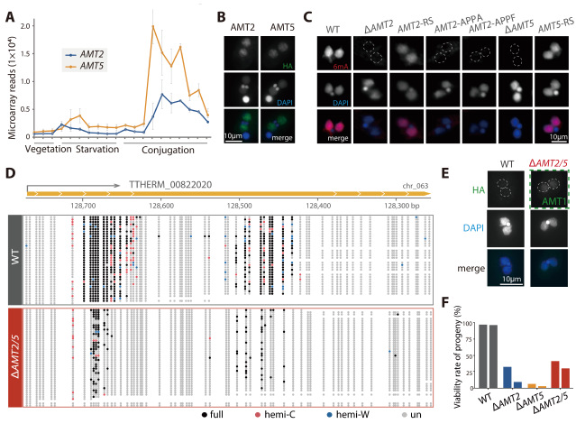 图2. AMT2和AMT5调控新大核中6mA的从头建立。(A)AMT2和AMT5在新大核发育时期高表达;(B)AMT2和AMT5定位在新大核;(C)AMT2/AMT5敲除导致新大核6mA水平下降,野生型AMT2/AMT5回补可使新大核中6mA水平恢复,突变回补不能使6mA水平恢复;(D)SMRT-CCS结果显示敲除株系中6mA位点数大量减少,甲基化水平显著下降;(E)敲除株系后代中AMT1蛋白水平相比野生型上调;(F)AMT2/AMT5敲除导致后代存活率下降。