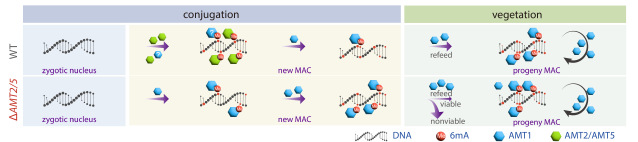 基于以上结果,团队提出了6mA的调控通路模型(图3):在野生型四膜虫中,无6mA的合子核发育为有6mA的新大核的过程中,从头甲基化酶AMT2和AMT5将未甲基化的腺嘌呤催化为半甲基化,随后由维持性甲基化酶AMT1将其进一步转化为全甲基化;进入无性生殖时期后,AMT1的持续高表达确保了6mA在细胞分裂过程中的稳定遗传。在AMT2/AMT5敲除细胞中,AMT1同时发挥(较弱的)从头甲基化酶和维持性甲基化酶活性,仅能在极少数位点添加6mA且甲基化水平显著偏低;当细胞进入无性生殖时期后,AMT1水平的升高使大量未甲基化位点可以被甲基化,但仍可能存在甲基化模式的紊乱。