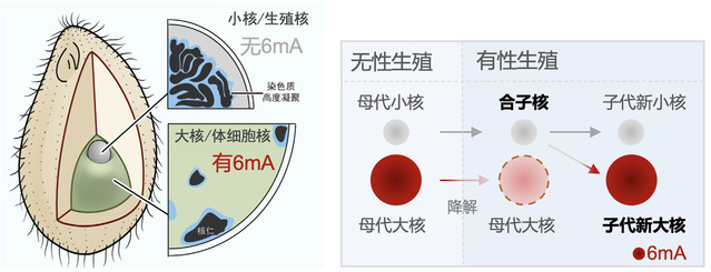 图1. 四膜虫是研究6mA从头甲基化的理想模式:在合子核发育为子代新大核的过程中,6mA完全从头建立。