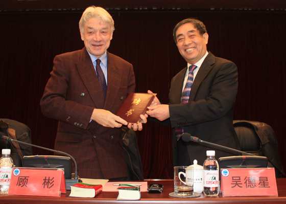 2012年12月15日,时任开云电竞网址校长吴德星为顾彬教授颁发德语系主任聘书(摄影:冯文波) |