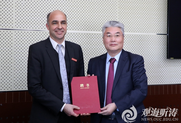 于志刚校长(右)为Thomas Mock教授颁发聘书