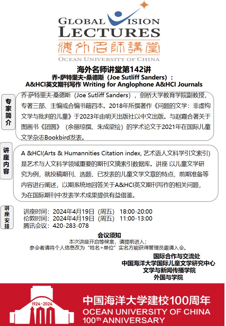 海外名师讲堂第一百四十二讲 乔·萨特里夫·桑德斯(Joe Sutliff Sanders): A&HCI英文期刊写作 Writing for Anglophone A&HCI Journals