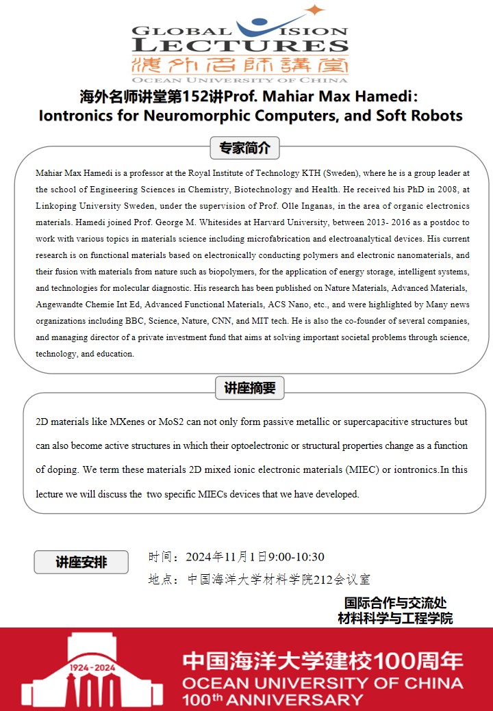 海外名师讲堂第一百五十二讲Prof. Mahiar Max Hamedi: Iontronics for Neuromorphic Computers, and Soft Robots