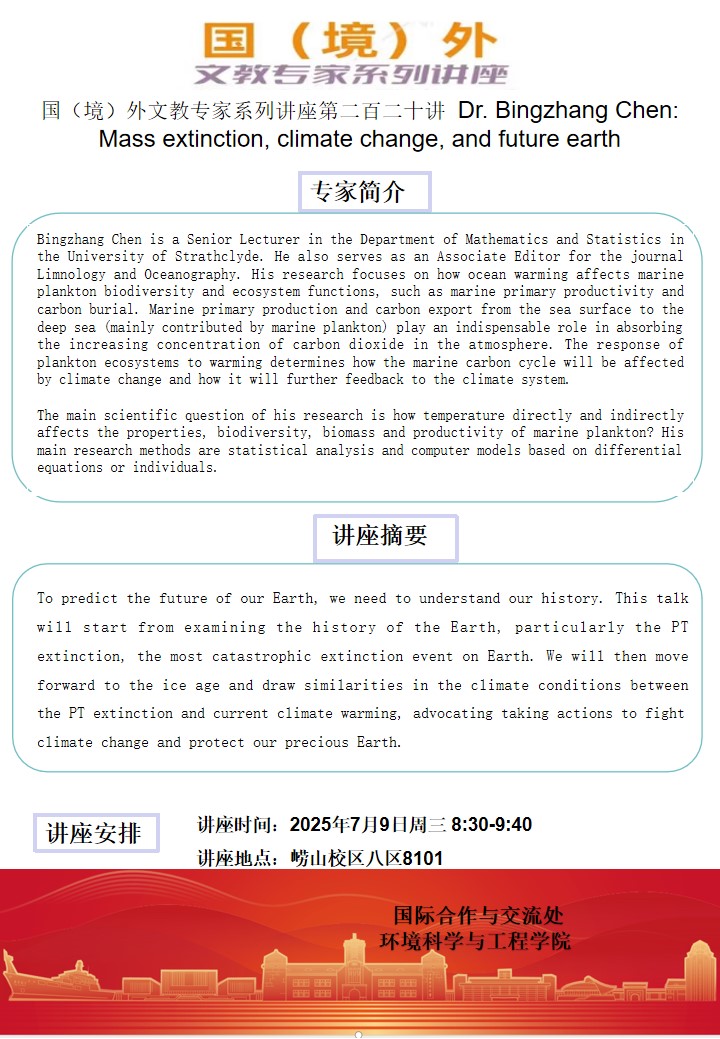 国(境)外文教专家系列讲座第二百二十讲 Dr. Bingzhang Chen: Mass extinction, climate change, and future earth