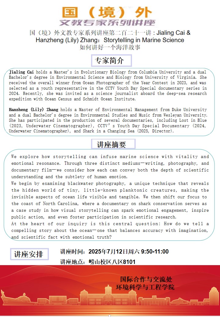 国(境)外文教专家系列讲座第二百二十一讲 : Jialing Cai & Hanzheng (Lily) Zhang:Storytelling in Marine Science 如何讲好一个海洋故事