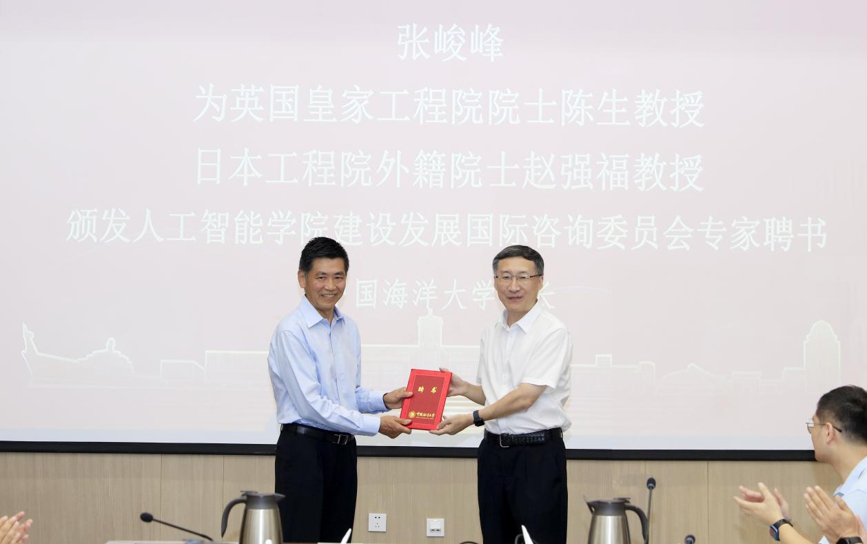 张峻峰(右)为陈生颁发人工智能学院建设发展国际咨询委员会专家聘书