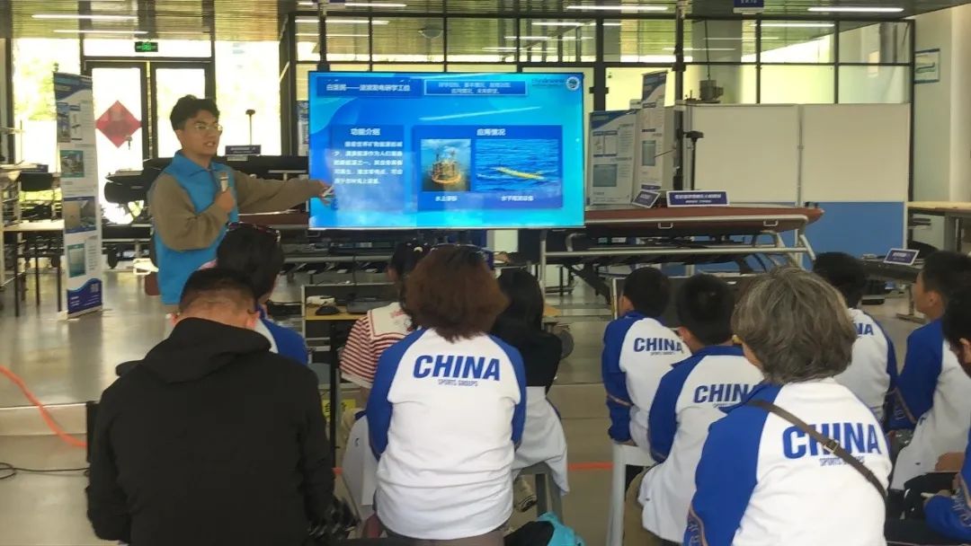 劳动节假期期间,在专家的带领下,同学们深入了解了海舟海洋观测装备的工作原理和技术特点。研学青年老师们详细介绍了波浪滑翔器设备的组成、功能以及操作流程,让同学们对这型海洋无人装备有了更加直观的认识。同时,老师们还讲解了海洋装备开发的过程和难点,让同学们深刻感受到了海洋无人装备开发的艰辛和不易。