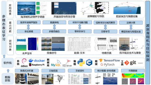 多模态学习是一种机器学习方法,旨在处理和分析不同的模态(数据类型或信号源,如图像、语音、文本和传感器数据等)的信息,克服声学单一模态的不足,提升目标识别能力。在声学探测的基础上,对波浪滑翔机进行多源信息融合,利用传感器互补性增强系统适应性,优化目标识别,最大化数据优势,提高检测精度和理解能力。