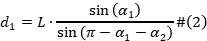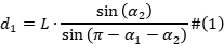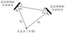 采用波浪滑翔机搭载被动声学阵列进行多基阵被动水声定位方法研究。方位交叉定位对信号形式、信号相关性、海洋水温参数等无特别要求,依赖北斗卫星的精确授时技术,具有工程可实现性。主要思想如下:首先判断两个目标是否属于同一波浪滑翔机被动声学阵列,同一阵列发现的目标不做交叉计算;其次,根据北斗定位计算两台波浪滑翔机声学阵列之间的距离 L 和与正北方的夹角,同时确定波浪滑翔机之间的相对位置,进而确定基准位置;然后,进行坐标变换以修正声学阵列与正北方向产生的模型坐标系方位差;根据声学基阵的实际情况对计算所得的交叉点进行过滤以降低计算复杂度,如根据声学阵列的相对距离和角度去除实际不可能存在的交叉点;根据公式(1)、公式(2)计算交叉点与声学阵列A和B的相对距离。
