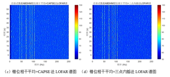 综合所有LOFAR谱图来看, ABDHM错位相干平均法(14次错位)结合CAPSE法和三点内插法在实际海洋环境噪声干扰下,相较于传统方法能对目标船只的线谱进行更加有效的检测, 并且两种方法的LOFAR谱图背景噪声基底较传统方法大幅下降,提升了目标线谱信号信噪比。