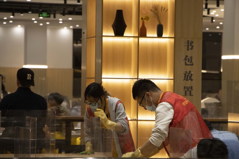 正式开始后,同学们便开始按照垃圾分类标准对剩饭和垃圾进行初步分类,将纸杯、卫生纸等与剩饭剩菜分开处理,再将盘子按照不同规格分类摆放整齐,同时另一批小伙伴们认真清理着墙壁与餐桌上的污渍,很快餐具回收台的餐盘很快便堆起了厚厚一摞。晚上19点30分,在师生们用餐基本结束后,志愿者们继续热火朝天地投身于用餐后最后的餐桌清洁中。在3个小时左右的实践活动中,时常有前来就餐的老师和同学们向正在认真付出的志愿者们投来了赞许的目光。