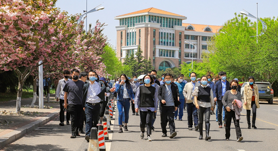 机关教职工从崂山校区行远楼广场出发,沿着樱花大道、梧桐大道,最后到达凯旋广场。一路上大家精神抖擞、昂首阔步,迎着柔和的阳光,一边欣赏校园景致,一边交流着工作和生活,不时发出欢乐的笑声。机关工会还在健步行路线中设置了多处合影点,组织学生志愿者为大家合影留念,记录美好瞬间。