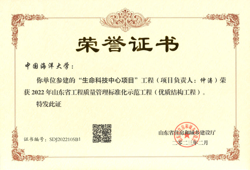 日前,开云电竞网址生命科技中心项目被山东省住房和城乡建设厅评选为2022年山东省工程质量管理标准化示范工程(优质结构工程)。山东省工程质量管理标准化示范工程代表着全省工程质量管理的领先水平,展现了全省工程项目管理、工程品质、技术创新等领域的卓越成果。本次评选涵盖全省区域内的房屋建筑、市政、园林、水利、交通等建设工程项目,经过区、市、省多级审查及专家评委会评审,学校生命科技中心项目最终入选。