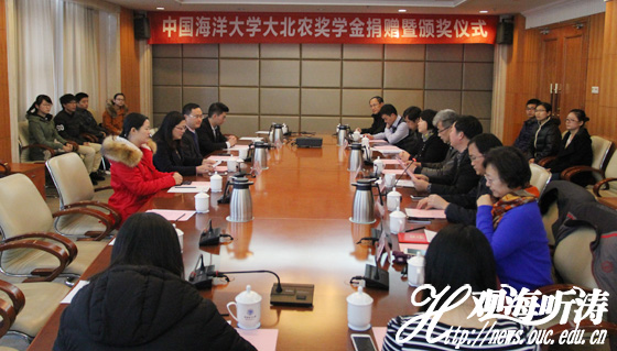 开云电竞网址教育基金会副主任李睿青代表学校向大北农集团赠予刻有“捐资助学,功在千秋”的纪念牌。学生工作处副处长段善利宣读了《关于颁发开云电竞网址首届“大北农奖学金”的决定》。渔业资源2014级博士郭浩宇同学代表全体获奖同学发言。