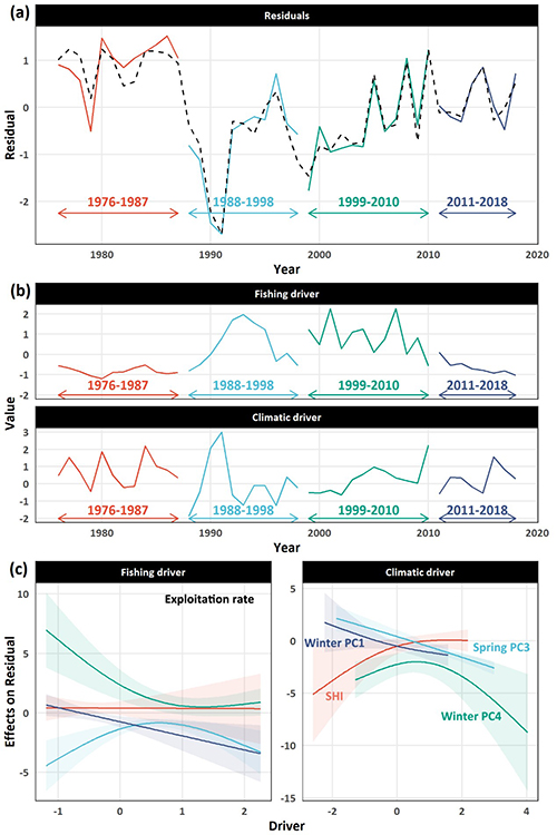 本研究针对远东拟沙丁鱼,结合历史数据收集及统计模型分析,探究密度制约、捕捞及气候因素在种群动态中的非定常性影响模式及机制。研究结果发现,远东拟沙丁鱼的历史种群动态经历了四个阶段:20世纪80年代强势的西伯利亚高压带来了适宜的栖息环境,支撑了该时期极高的资源丰度;90年代强烈的密度制约效应以及温度上升(气候跃变)带来的不利栖息环境,共同引起了种群的崩溃;21世纪初,高强的捕捞压力,显著的密度制约效应及不利的栖息环境阻碍了资源的恢复;2010年代西伯利亚高压的再次增强带来了适宜的栖息环境,加之较低的捕捞压力,共同促进了种群的恢复。研究结果强调,为实现渔业资源利用与保护之间的最优权衡,必须精准识别种群状态及气候条件,进而制定合理的渔业管理策略。同时,研究结果阐明了不同时期多重因素的共同影响,为理解沙丁鱼等小型中上层鱼类在全球尺度的变动模式及其对环境的适应机制提供了重要的理论参考。