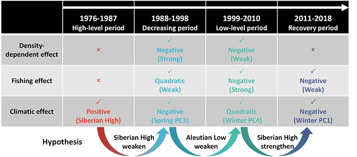 图3 密度制约、捕捞及气候因素在远东拟沙丁鱼种群动态中的非定常性影响模式及可能机制