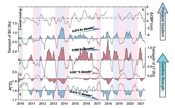 研究团队从2009年开始对吕宋海峡“深水瀑布”开展长期连续观测,先后在巴士海峡、吕宋海槽和恒春海脊关键海槛处构建了5个长期固定观测潜标站。前期,基于观测数据已系统刻画了“深水瀑布”的空间特征和运动路径,准确给出了其多年平均流量,并揭示了“深水瀑布”秋冬强/春夏弱的季节变化特征及混合驱动机制。日前,基于已获取的连续12年的流速和流量数据,研究团队首次揭示了吕宋海峡“深水瀑布”的年际变化和持续增强趋势。研究结果显示,吕宋海峡“深水瀑布”的通量在过去12年中增加了0.074 ± 0.045 Sv,约占总流量的9 ± 5%,同时流核位温降低了-0.010 ± 0.008 ℃。进一步分析显示,吕宋海峡两侧压强差年际增加趋势是“深水瀑布”增强的关键调控因素。