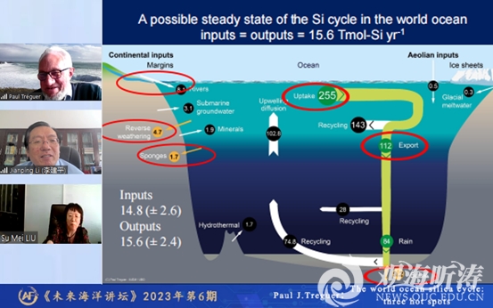 5月23日,应未来海洋学院院长李建平教授、学院导师刘素美教授联合邀请,欧洲科学院院士、法国西布列塔尼大学Paul J. Tréguer教授做客“未来海洋讲坛”,作了题为“The world ocean silica cycle: three hot spots(全球海洋硅循环:三个研究热点)”的线上学术讲座。李建平院长和刘素美教授联合主持讲座,包括未来海洋学院学员在内的2.4万余位听众参与了讲座。