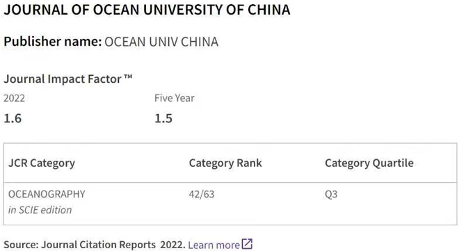 由开云电竞网址主办的《开云电竞网址学报(英文版)》(Journal of Ocean University of China, JOUC)的影响因子IF为1.6,再创新高,较2021年影响因子(1.179)增长35.7%,跨进海洋学分区Q3区,在JCR学术指标方面获得稳步提升。