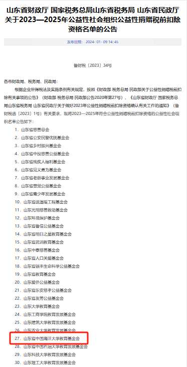 近日,省财政厅、省税务局、省民政厅联合发布了2023—2025年公益性社会组织公益性捐赠税前扣除资格名单的公告,我校教育基金会名列其中。