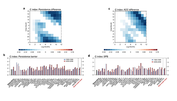 图1 (a) CP型ENSO可持续性系数的季节变化。(b) CP型ENSO的春季可持续性障碍强度。(c)和(d)与(a)和(b)相同,但表示的是可预报性。