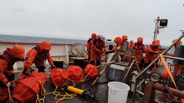 此次潜标回收工作得到国内外单位的大力支持。中国第41次南极考察环南极航次队长、中国极地研究中心高级工程师曹叔楠从航次开始之前就一直积极沟通协调,山东大学博士后刘宁华将回收潜标所用的甲板单元和配件带到巴西登船。最终在环南极航次俄方队长、俄罗斯南北极研究所(AARI)副研究员Nikita Kusse-Tiuz的指挥和组织下,中国、俄罗斯、巴西、智利、阿根廷、印度、秘鲁等国家考察人员共同努力,将潜标回收到“特里奥什尼科夫院士”号上。在航次已严重超时的情况下,资助方瑞士阿尔伯特冰冻圈基金会和考察船单位俄罗斯南北极研究所一致同意,放弃最后航段的原计划站位,将回收潜标工作作为航次最后的唯一任务,并且免除了由此产生的额外船时费用。此次成功回收潜标成为国际合作南极考察的典范。