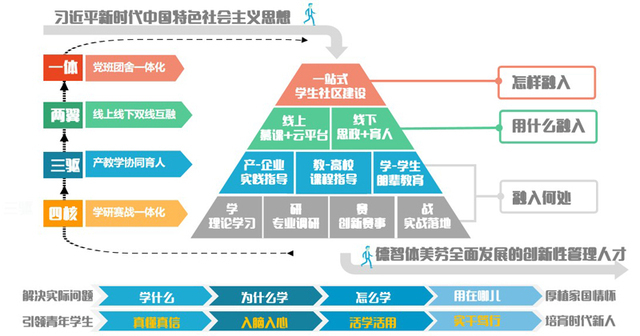 管理学院不断探索习近平新时代中国特色社会主义思想融入高校思想政治教育的创新路径,建设一站式学生社区“新阵地”,“党团班舍”一体化抓实育人最后一公里,解决怎样融入的问题;运用“线上+线下”的“新载体”,“双线混融”做好理论的阐释和传播,解决用什么融入的问题;“产教学”协同育人,将理论融入“学研赛战”思政教育“新模式”,思专创融合,贯穿教育实践全过程,解决融入何处的问题,形成了“大思政”格局下“一体两翼三驱四核”的“星火燎原”习近平新时代中国特色社会主义思想大学习领航工程,引导青年学生做到真懂真信、入脑入心、活学活用、实干笃行。2024年,管理学子用行动丈量祖国大地,用心灵感应时代脉搏,95.43%的学生投身创新实践,牵头项目获评教育部A类赛事国家级奖项21项,创历史新高。