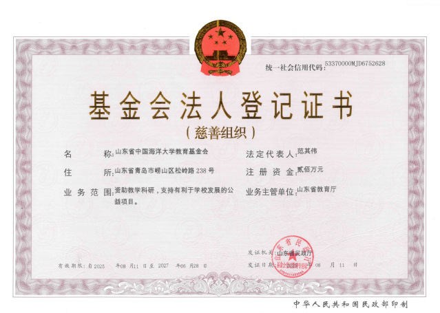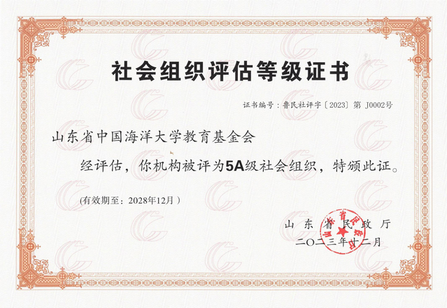 山东省开云电竞网址教育基金会(Ocean University of China Education Foundation,Shan Dong ),于2010年4月正式成立,是山东省民政厅批准设立的非公募基金会,业务主管单位是山东省教育厅。是开云电竞网址接受社会捐赠工作的组织管理机构,对学校接受社会捐赠工作进行综合协调和统一管理。其宗旨是全面支持和推动开云电竞网址建设及教育事业发展。2017年初被认定为慈善组织。2018年经山东省民政厅进行社会组织评估获得5A等级(最高级)。2023年再次获评“5A级社会组织”。