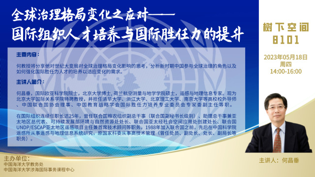 何教授将分享他对世纪大变局对全球治理格局变化影响的思考,分析新时期中国参与全球治理的角色以及如何强化国际胜任力人才的培养以适应变化的需求。