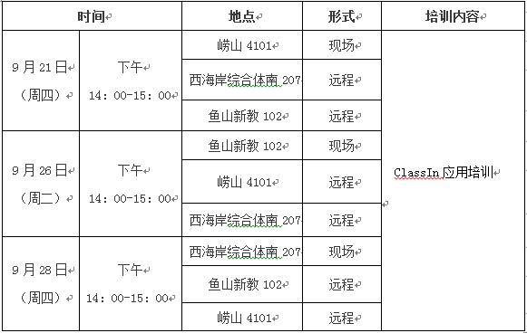 ClassIn在线课堂是当前我校重点使用的在线教学软件,在疫情期间的在线教学过程中发挥了重要作用。目前,学校多校区办学给师生在教学过程中造成了诸多不便。此外,按照本年度本科教学审核评估工作的要求,评估专家将在校外线上对我校的课堂教学情况进行调研,根据我校信息化教学工作的现状,此次审核评估专家线上课堂调研将依托我校ClassIn在线课堂实施。为方便广大教师跨校区教学,支持本科教学审核评估工作的顺利进行,经教务处研究决定,本学期拟组织开展基于ClassIn在线课堂应用为主要内容的培训,现将培训的相关事宜通知如下: