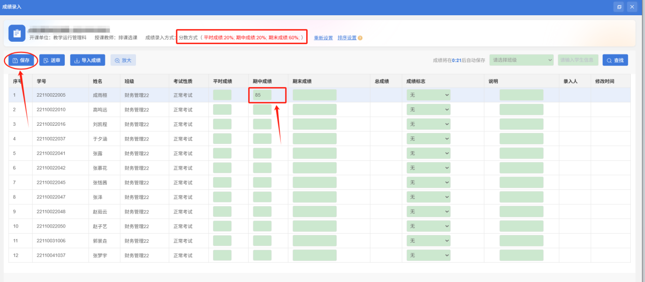 步骤三:录入“期中成绩”→全部录入完毕后点击“保存”即可。