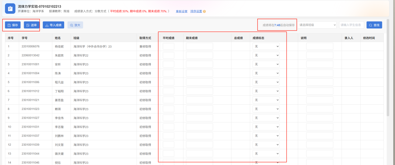 2、自动保存机制。录入成绩界面的右上角会有一个自动保存成绩的倒计时,到时间会自动保存一次成绩。