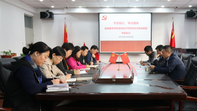根据直属业务部门第二党总支“不忘初心、牢记使命“主题教育实施方案要求,2019年10月29日,继续教育学院党支部召开领导班子对照党章党规找差距专题会议。直属二总支副书记、继续教育学院副院长刘杰主持会议。