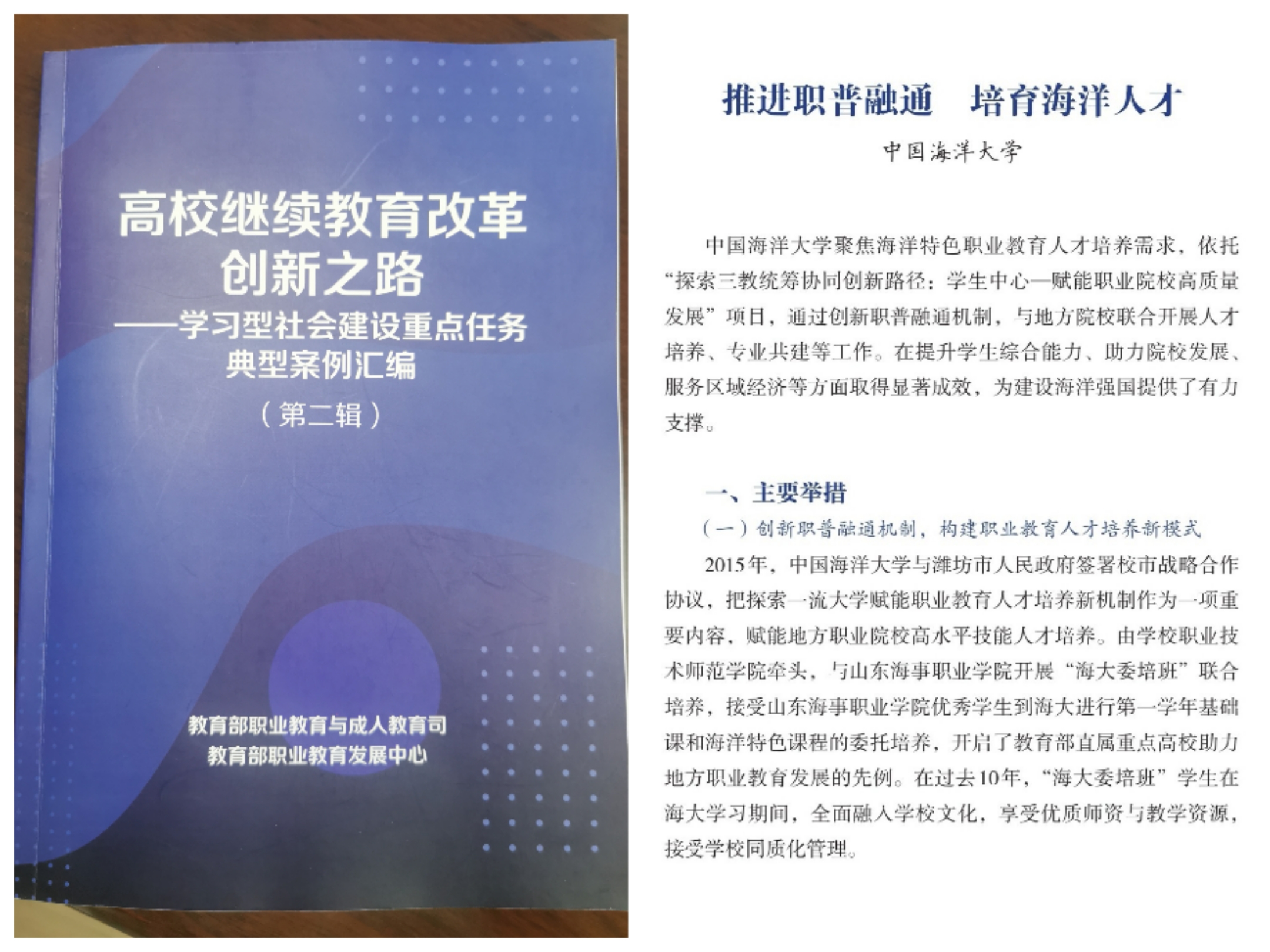 自2015年以来,学校已为山东海事职业学院委培优秀学子1000余名,为职业院校学生多元成长、山东海洋产业高质量发展做出了一流大学的应有的突出贡献。2025年4月,教育部职业教育与成人教育司、教育部职业教育发展中心联合发布了《高校继续教育改革创新之路-学习型社会建设重点任务典型案例汇编》,“开云电竞网址推进职普融通、培育海洋人才”作为优秀实践成果获得入选,成果以山东海事职业学院海大委培班为例,从学校赋能职业院校高质量发展的角度诠释了海大在继续教育内涵建设、优化服务模式、促进全民终身学习方面的探索与突破,得到全国高校广泛学习和推介。