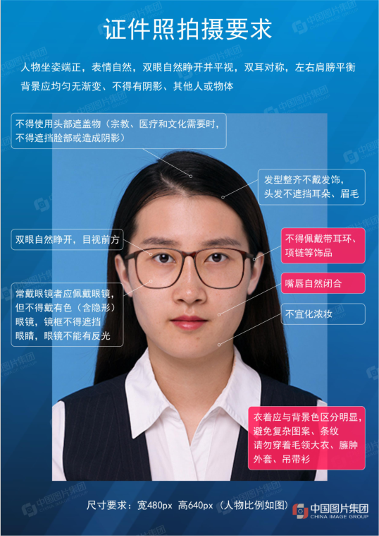 1.拍照时不可佩戴首饰、美瞳、头发不可遮挡眉毛及耳朵,不可露齿、眼镜不能有反光、镜框不得遮挡眼睛、不宜化浓妆。