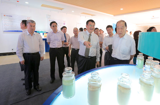 海大生物集团董事长单俊伟(前右二)向于志刚校长(左一)、管华诗院士(右一)等介绍集团产品